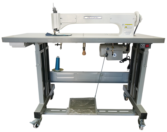 The complete machine from Artisan includes the exclusive ACF-550 Electronic Servo Motor Stand Drive Unit, a USA-manufactured plywood laminated table top, adjustable “T” style steel legs, SMT LED magnetic base lamp, drawer, spool of thread, extra needles, and additional accessories. The exclusively Artisan designed, special 750-watt electronic servo motor, allows operators to sew very slowly with complete control. The ceiling stitch speed can also be set to maximum for high-production sewing.