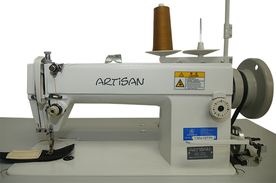 The Artisan GC-202 Denim Stitching Machine is an “M” size, Big Bobbin Sewing Machine designed for stitching from light to medium heavy weight Leather or Canvas such as belts, chaps wallets, checkbook covers, jackets, vests, pants, skirts, and much more. The Artisan GC-202 Denim Stitching Machine is an economy Upholstery and Light Leather Stitcher. The machine will sew thread from size z-46 up to z-138. And from paper thin up to 3⁄8” thick. Each GC-202 machine includes a fully automatic lubrication system with a large dial operated, stitch length regulator, and features a large lever-operated reverse stitching handle.